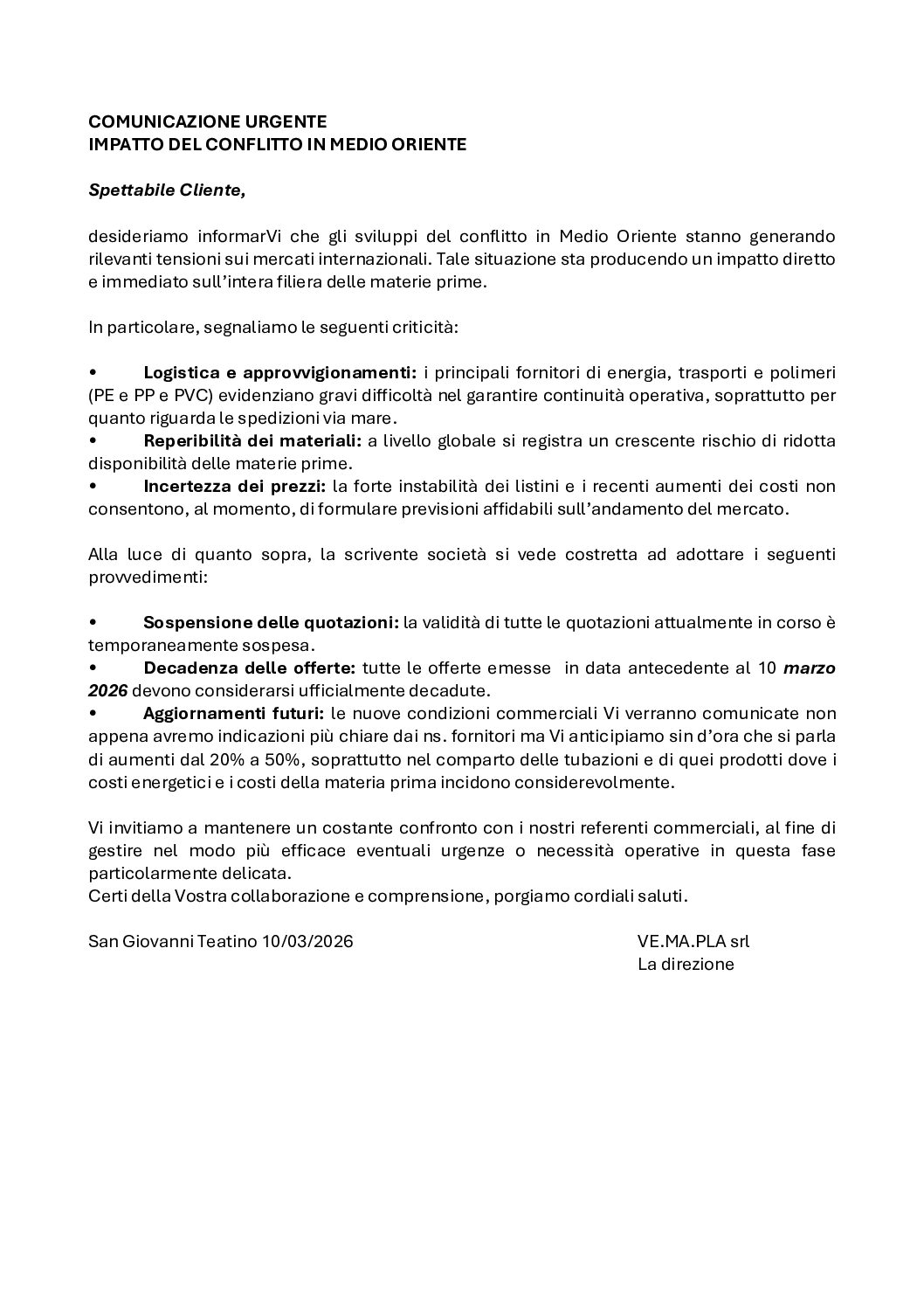 COMUNICAZIONE URGENTE IMPATTO DEL CONFLITTO IN MEDIO ORIENTE